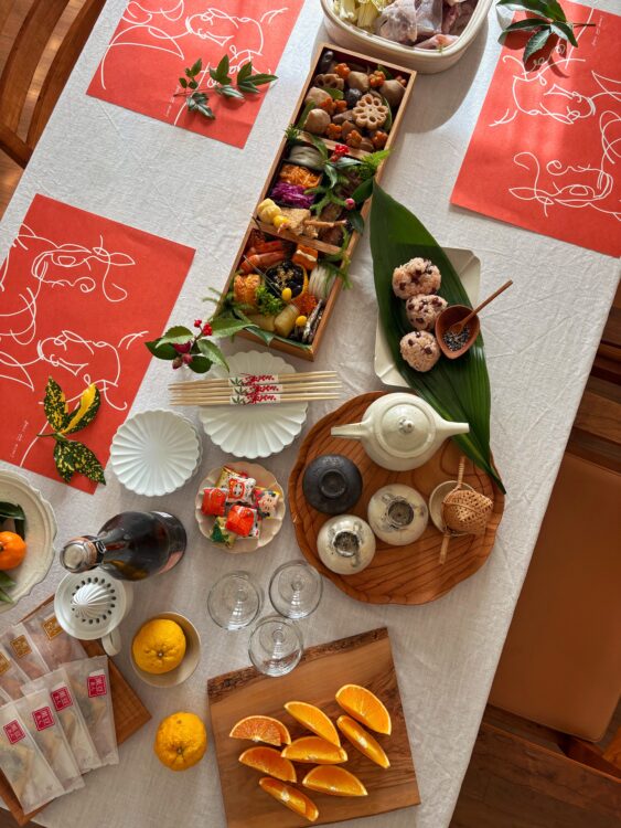 合わせて、祝い箸や、テーブルマットがあると手軽にお正月のテーブルコーディネイトが完成します。赤と白で紅白、黒やゴールドで高級感を出すのも良いですね。