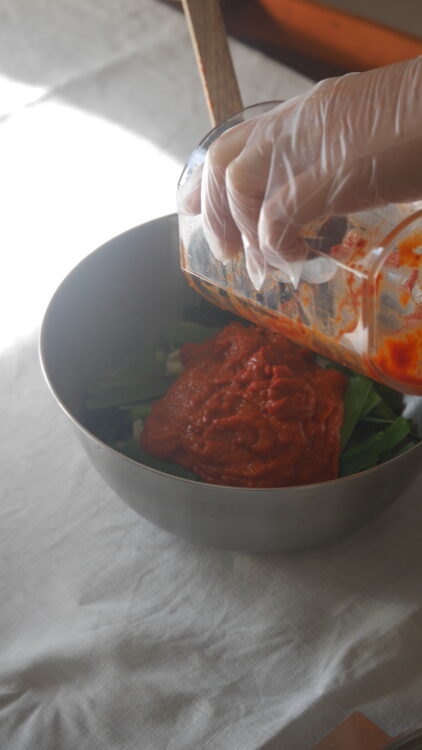 レッスンでは、植物性の材料と発酵調味料を使ってヴィーガンキムチを作りました。浅漬けにした白菜を洗ってしっかり水気を切り、ヴィーガンキムチの素と和えます。